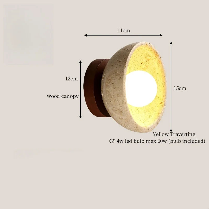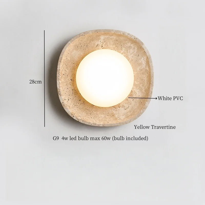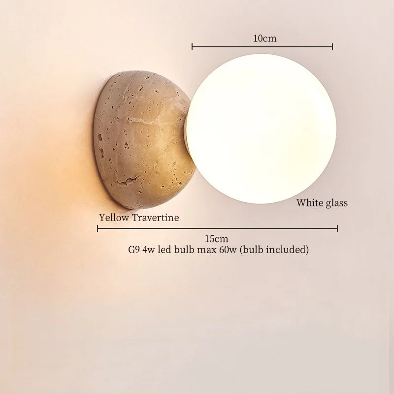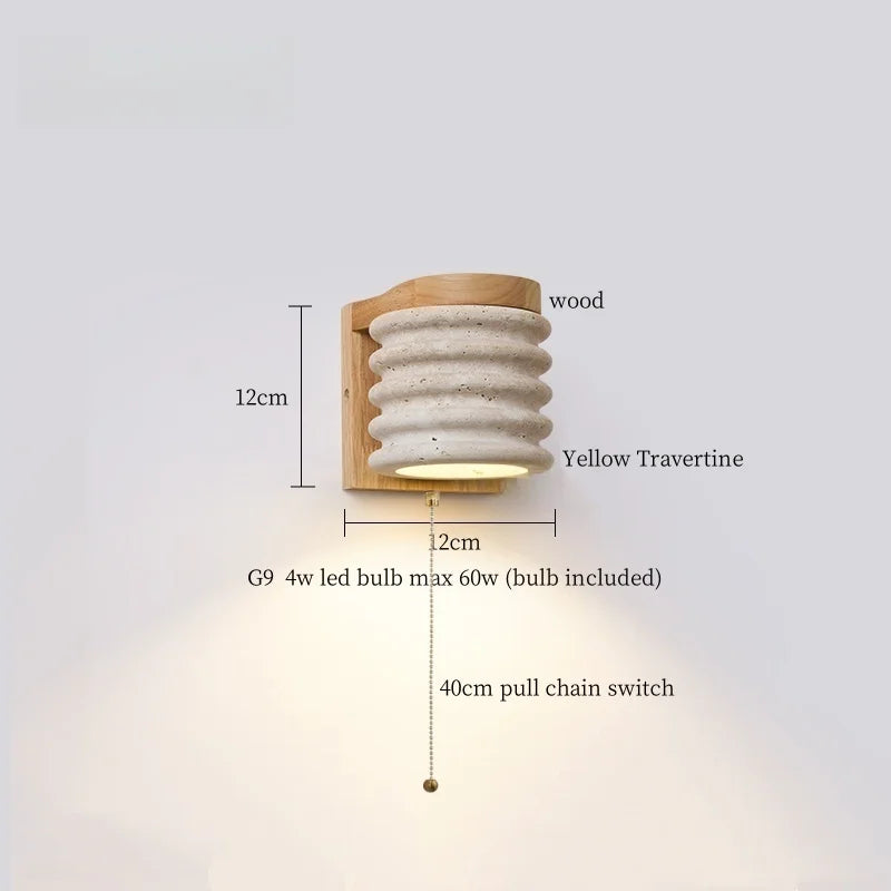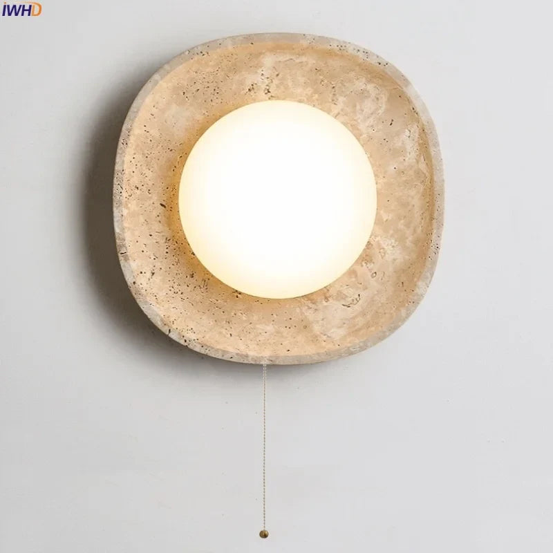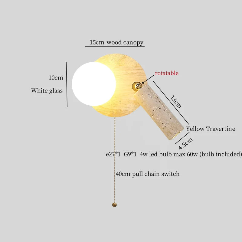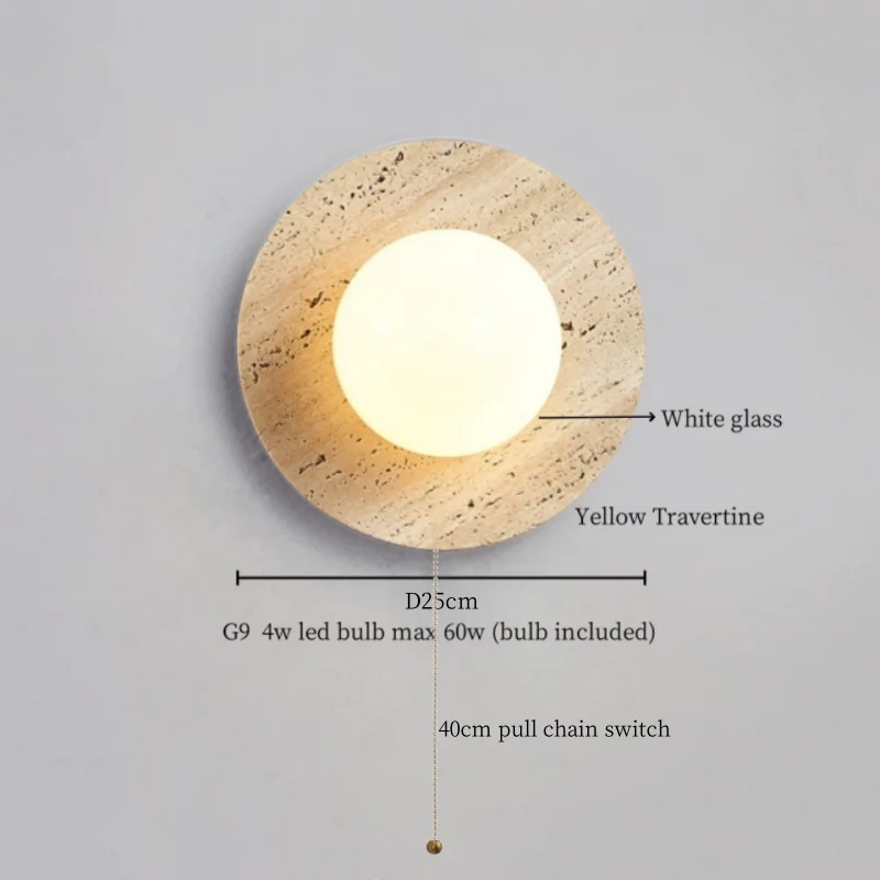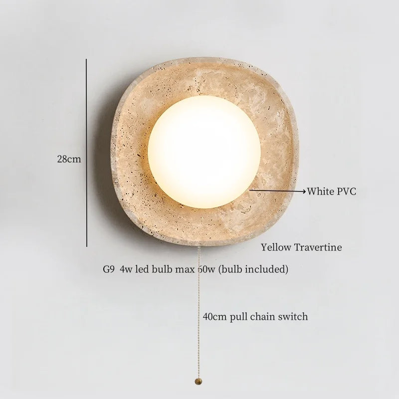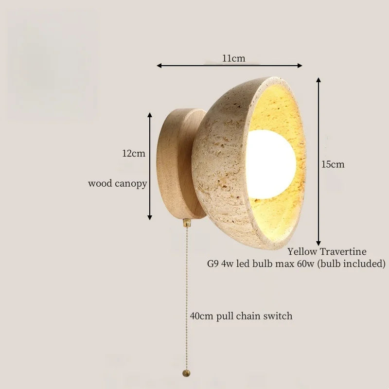 Illuminate your space with style and sophistication with our Axyaa Vintage Wabi Sabi LED Wall Lamp.Upgrade your interior lighting with our Axyaa Vintage Wabi Sabi LED Wall Lamp with Pull Chain Switch. This stylish wall lamp features a unique yellow travertine body that adds a touch of elegance to any room. The self-contained installation method makes it easy to mount on your wall, while the glass lampshade allows the LED light source to shine brightly.
