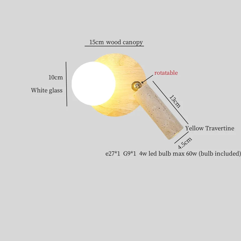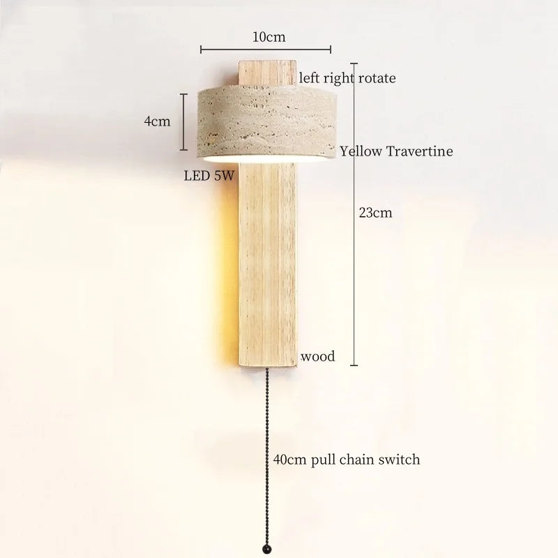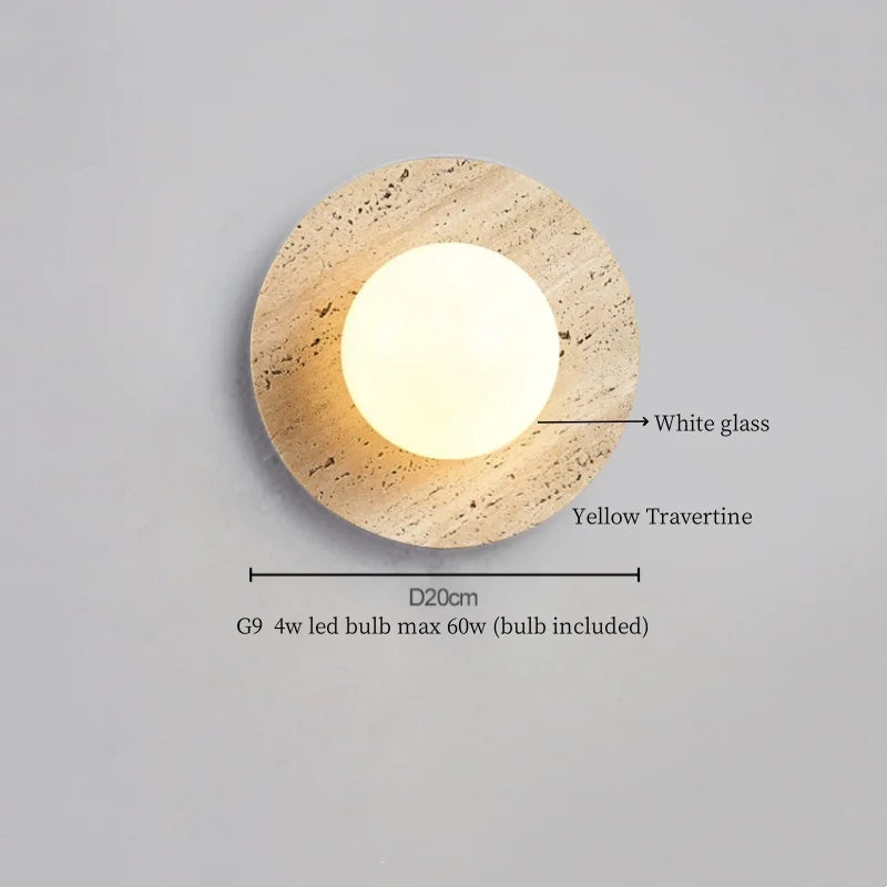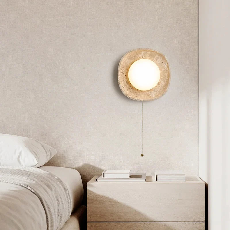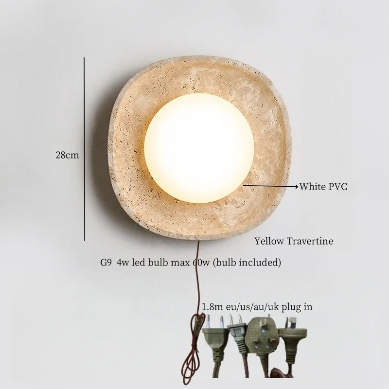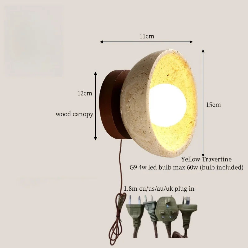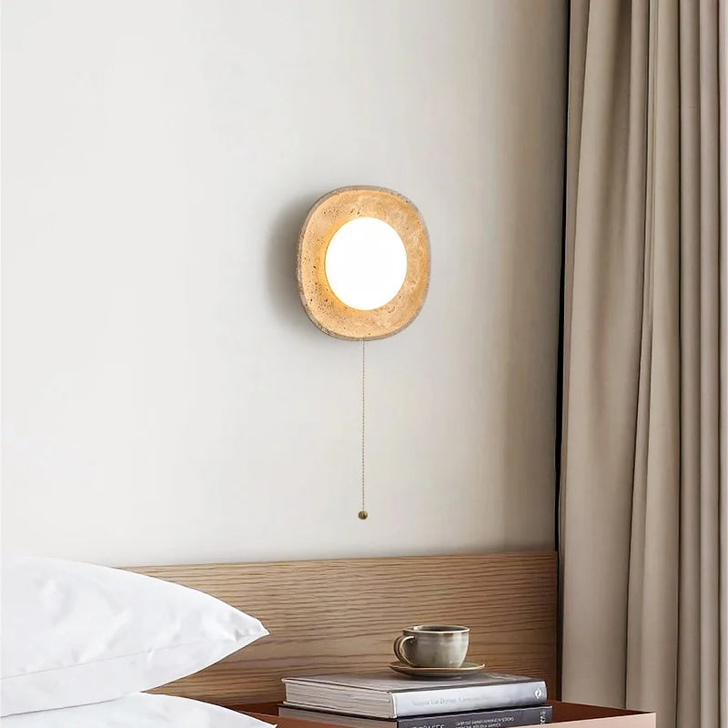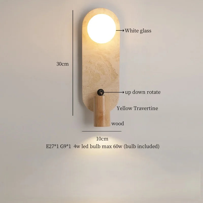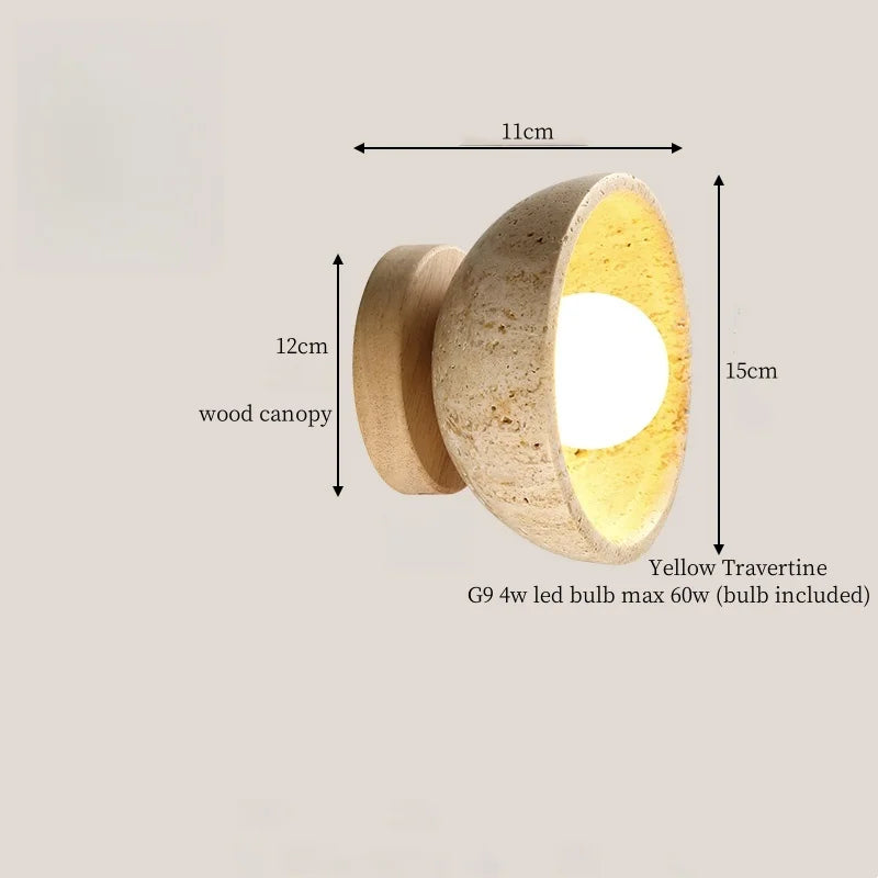 Illuminate your space with style and sophistication with our Axyaa Vintage Wabi Sabi LED Wall Lamp.Upgrade your interior lighting with our Axyaa Vintage Wabi Sabi LED Wall Lamp with Pull Chain Switch. This stylish wall lamp features a unique yellow travertine body that adds a touch of elegance to any room. The self-contained installation method makes it easy to mount on your wall, while the glass lampshade allows the LED light source to shine brightly.