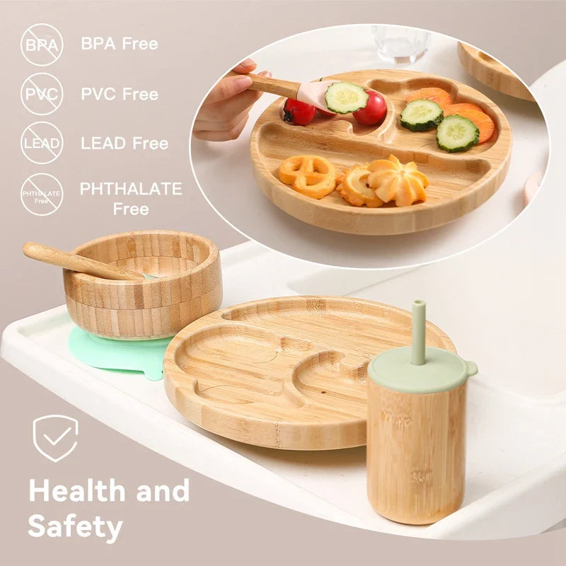 With a charming and stylish design, our Bamboo Baby Feeding Set adds a touch of elegance to children's tableware. The wooden dinner plate and bowl, along with the 7-piece feeding set, provide a complete dining experience that is both functional and visually appealing
