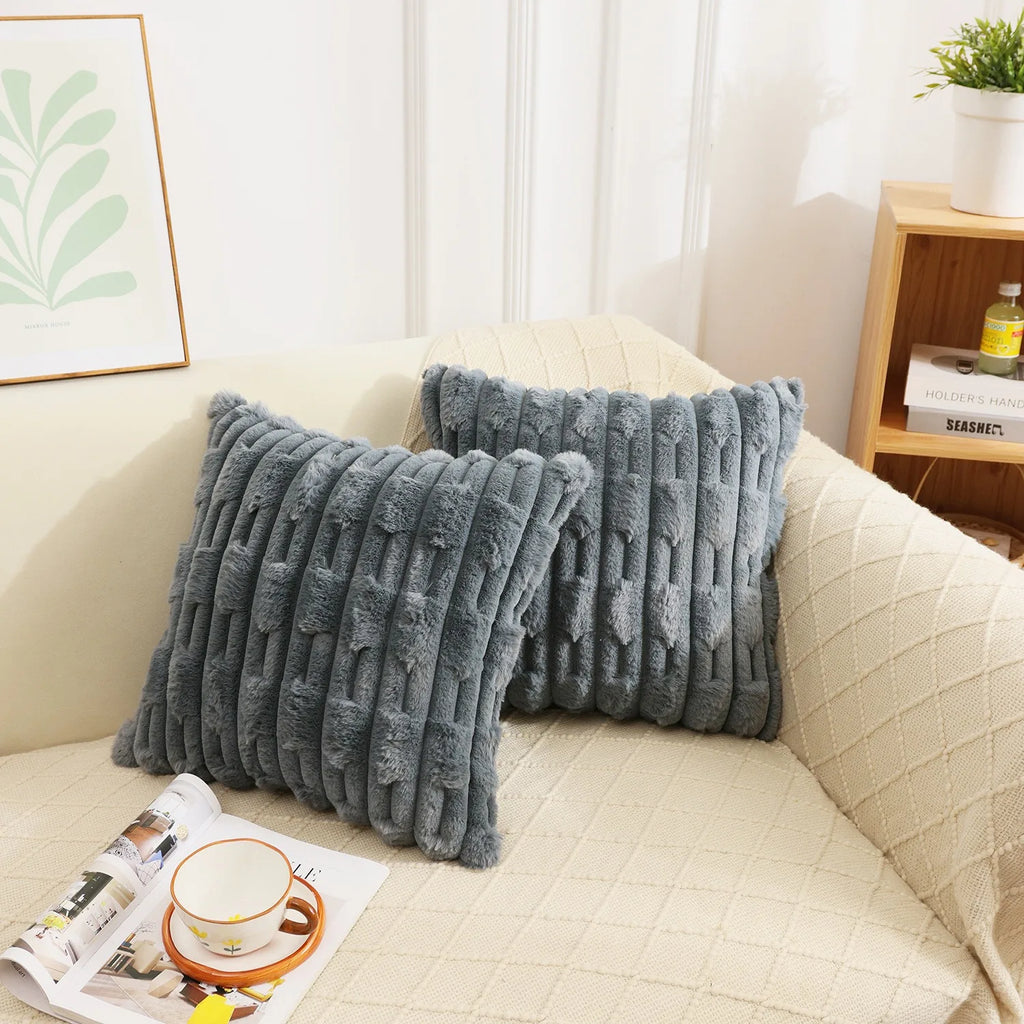 Axyaa Boho Striped Faux Rabbit Fur Velvet Cushion 18x18In Beige